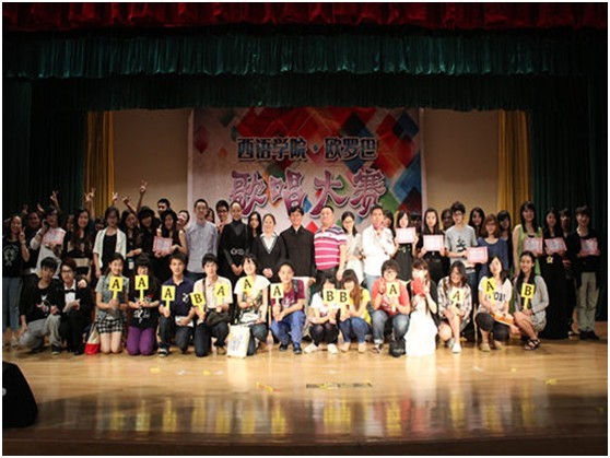 本网讯 2013年4月18日晚上七点,西语学院欧罗巴文化节之“夜莺与玫瑰”歌唱大赛在六教报告厅举行。进入决赛的21组选手分别来自6个学院,他们共用七种语言放声高歌,充分显示了我校的国际化特色。 本次比赛除聘请了七位评委外还有从全校海选出的17名大众评委参与评审。第一轮比赛正式开始,来自西语学院的选手个个使出看家本领,法语的浪漫抒情深入人心,《落叶》轻轻吟唱道出缠绵深情;俄语则活泼动感,不仅有电吉他伴奏,取得佳绩的西语女篮更是为《我们去掉天涯》可爱伴舞;西班牙语歌曲《爱的故事》讲述了奔放之外的温柔,《美女与野兽》唯美的歌曲与伴舞更让我们重温了童话的温暖;唯一的意语歌曲《当我说爱你的时候》更是活力四射,炫彩的面具带来了意大利的神秘;德语的美女组合歌喉婉转动人,配合默契;葡语带点嘶哑的浅唱更是引起全场观众的欢呼。来自其他学院的歌曲同样不甘示弱,激昂的《炎夏已逝》,动人的《英雄》一首首英语歌为本次大赛更增添亮丽一笔。