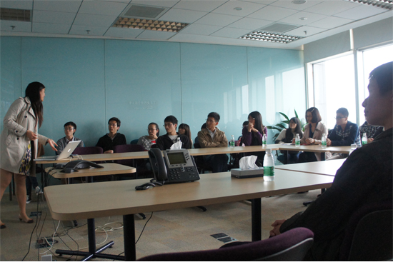 在思科公司的中型会议室,思科公司系统工程师黄文婷向师生进行公司介绍。黄文婷借助PPT、Flash、Videa等载体向师生们生动地介绍了思科的历史、文化、员工构成、主打产品、社会责任等知识。