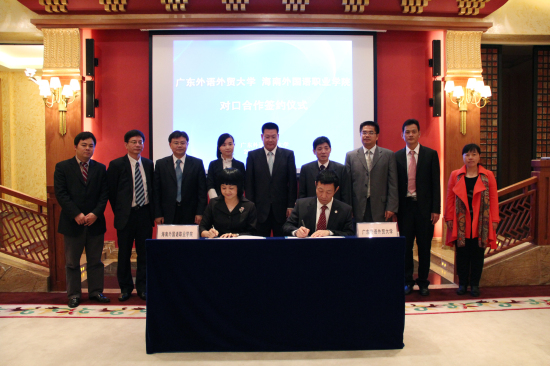 接着,双方签署了广东外语外贸大学和海南外国语职业学院对口合作框架协议书。签署完毕之后,双方重新落座进行了一个简短的交流。