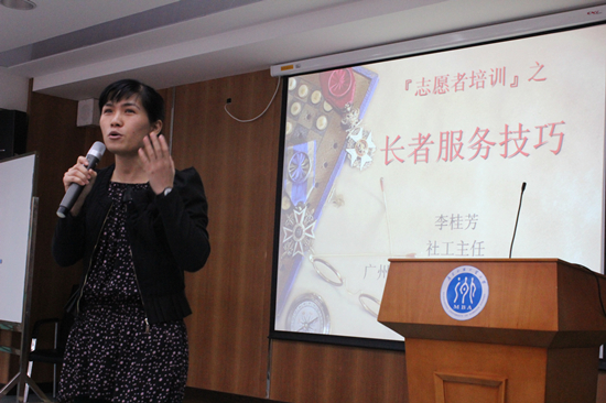 接着,李桂芳为志愿者做了专业培训。她说道,志愿者要了解长者的特点和需求。她介绍了与长者接触和沟通的技巧。例如,在沟通的基本价值感和态度方面,志愿者要有爱心、耐心、信心、诚意和敬意,还要设身处地地从长者的角度看问题。志愿者在交往过程中要考虑到话题、音量、语气、时间、环境等因素。在服务过程中,志愿者可以还发挥个人特长爱好的作用,为离退休教职工带来更多欢乐。