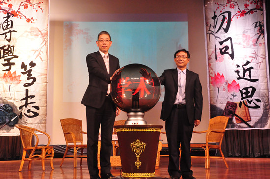 在随后的启动仪式中,财经学院院长杨友孝和黄寅先生一起手触透明的启幕球,在灯光的配合下,球体中跃动着红色耀眼的“第四届财经学术节”字样,现场掌声雷动,本届学术节正式启动。