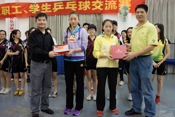 体育部党总书记李旭武,英文学院党委书记王斌、学院部分教职工和学生乒乓球队全体队员参加了本次交流赛。交流赛伊始,王斌和李旭武向两名省队队员赠送纪念品并合影留念。