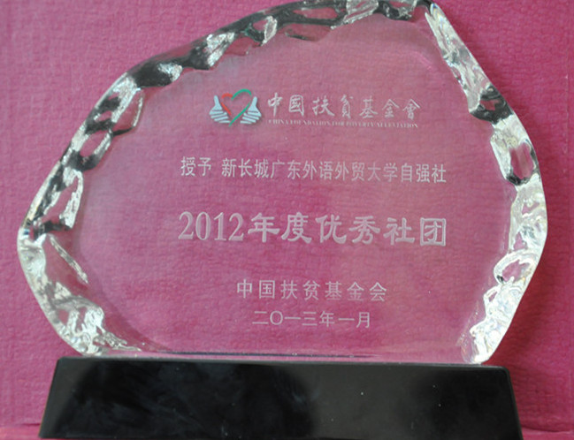 我校自强社成立于2005年9月15日,由中国扶贫基金会和校学生处共同指导和支持,是华南地区第一个成立的新长城自强社。在几届广外自强人的努力下,广外自强社2006年和2007年被评为“全国优秀自强社第二名”,2008年被评为“全国优秀自强社第一名”,2010年被评为“全国优秀自强社”,并获得广东省福彩公益奖;2011年被评为“全国优秀自强社”和“中国扶贫基金会爱心包裹优秀组织单位”,今年已是第六次获评“全国优秀自强社”。
