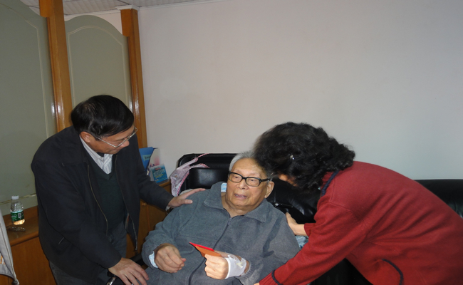 下午,陈建平一行又到医院探望了高力夫同志。送上了学校的节日慰问金,转交了省委省政府的节日贺卡和慰问金。高老今年98岁,也是1938年入党,离休前是原广州对外贸易学院院长顾问。高老和家人对陈建平一行的慰问和省委省政府及学校党委校领导的关怀表示非常感谢。