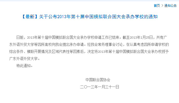 附:关于公布2013年第十届中国模拟联合国大会承办学校的通知