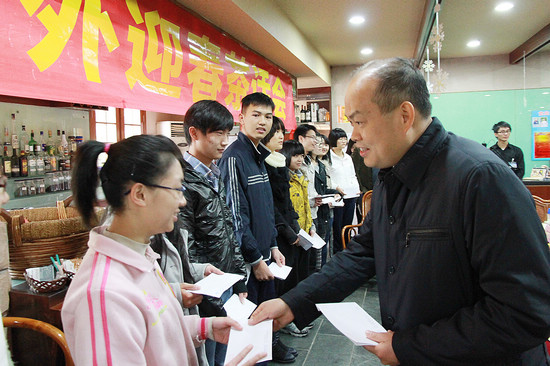 校领导关切慰问各留校学子的情况,茶话会进行在融洽温馨的氛围中。卢景辉首先给学子们送上迎春祝福与关心问候,并从“学习不间断;锻炼要加强;职业要思考;安全要警醒”四个方面劝诫留校学子珍惜假期生活,好好规划时间。他强调“安全要放在第一位”,提醒留校学子重视各方面的安全措施。“身体是本钱,”卢景辉说,“在进行各种寒假活动的同时,不要忘记锻炼身体与调节身心健康。”而谈及现今激烈的就业竞争,卢景辉嘱咐学生应在大学期间着手职业生涯规划,增加人生历练,从实践出发思考就业方向。