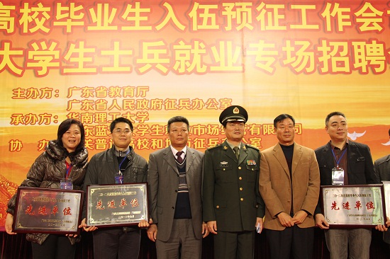 本网讯 1月11日,广东省2013年普通高校毕业生入伍预征工作会议在华南理工大学召开,我校在会上被授予“2012年高校毕业生入伍预征工作先进单位”。省军区副参谋长、省征兵办主任李晓南向我校代表颁授了奖牌。