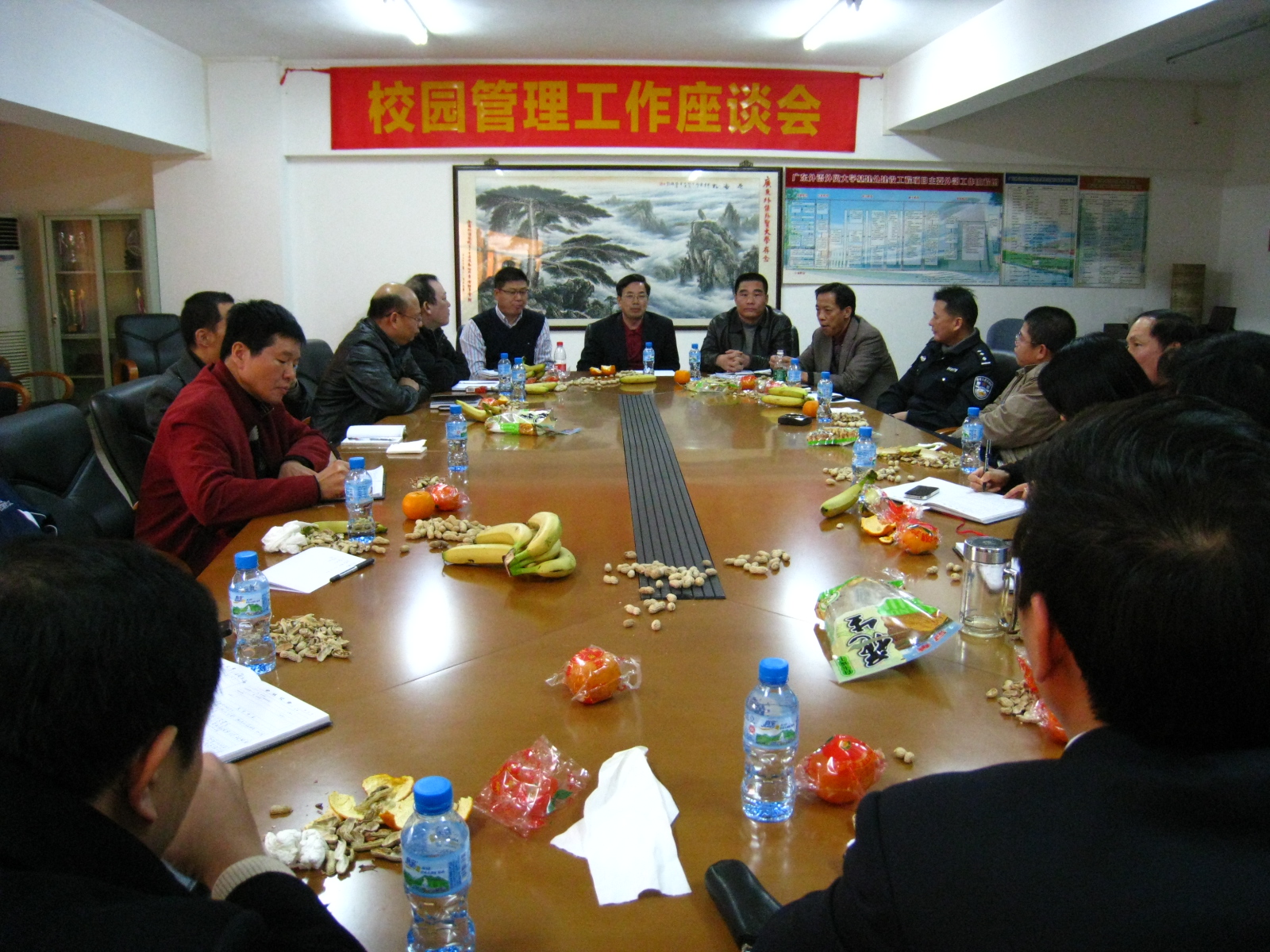 本网讯 1月7日下午,校园管理工作座谈会在后勤综合楼会议室召开,副校长何传添,保卫处处长钟罗军、资产处处长黄巧萍,后勤处处长杨思、总支部书记孙建军,驻校民警向艾军以及大众物业公司、宏德物业公司、华信物业公司等相关单位负责人20多人参加会议。座谈会由孙建军主持。
