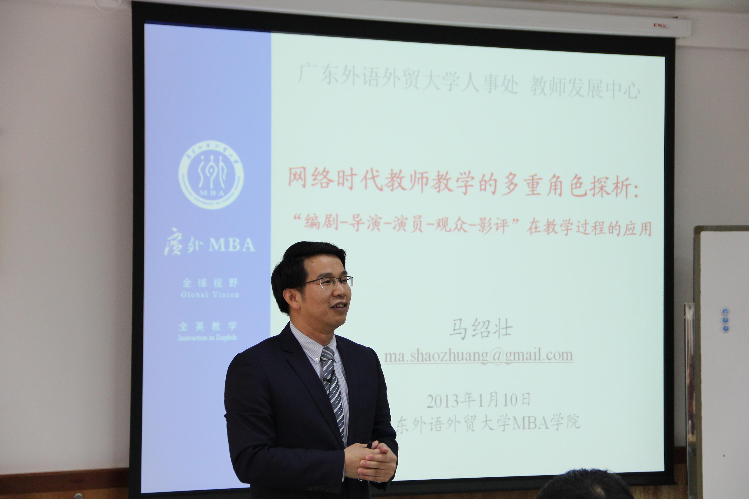 本网讯 1月10日下午,“云山教师沙龙”第九讲在九教(MBA学院)206课室举行, MBA学院副院长马绍壮博士围绕“网络时代教师教学的多重角色探析:‘编剧-导演-演员-观众-影评’在教学过程的应用”这一主题,与 40多位教师交流了教学经验与体会。