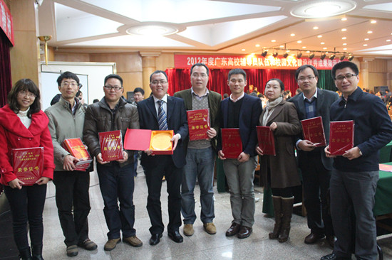 会议宣读了省教育厅相关表彰决定,并进行了表彰。我校获得2012年“立志、修身、博学、报国”主题系列教育活动优秀组织奖、2012年广东高校校园文化建设优秀成果一等奖、2012年广东高校辅导员年度人物等19个奖项。