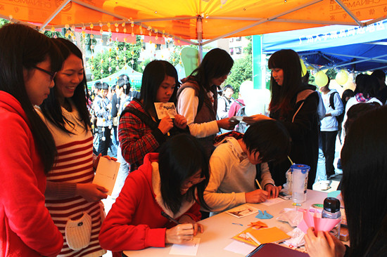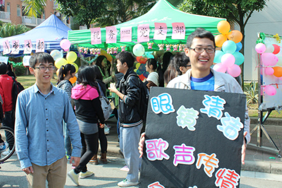 同为广外人,祝福便随行。不论是党建小组的“慢递”(明年3月可收到),还是其他党支部的“快递”(当天可收到),小小的明信片上都写满了同学们的心声和祝福。而“歌声传情”也不甘示弱,由开始时的羞涩独唱到后来的疯狂合唱,歌声与笑声洋溢着整个校道,并通过电话传送给彼端期待的TA,未曾相识,祝福依然真挚。