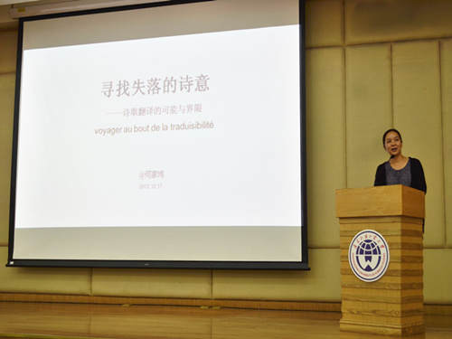 本网讯 12月17日晚7点,在图书馆负一层报告厅举行了由青年翻译家、92届法语校友何家炜主讲的主题为“寻找失落的诗意——诗歌翻译的可能与界限”的讲座,本次讲座由法语系主任杨晓敏主持,邀请了原广外校长黄建华,中文学院副院长刘小平,图书馆馆长伍方斐等嘉宾出席本次讲座。