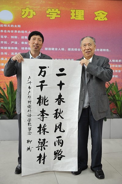 上午,考察团首先参观了附设外校,仔细了解外校办学特色、校园文化建设等情况,校长李建民逐一介绍,考察团一行对外校近年来的办学成果给予了充分肯定。明年恰逢附设外校建校二十周年,专家们欣然为外校题词。柳斌题词:“二十春秋风雨路,万千桃李栋梁材”;顾明远题词:“素质教育的基地,国际人才的摇篮”。