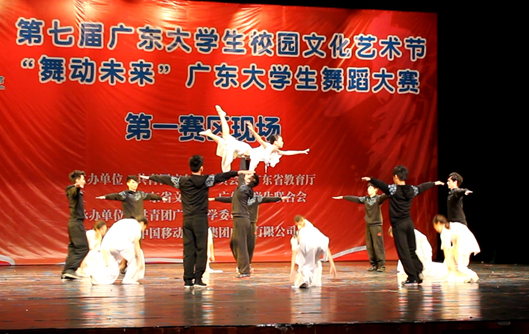 为迎接党的十八大胜利召开,展现当代广东大学生良好的青春风采和激情飞扬的大学校园生活,12月18日下午,第七届广东大学生校园文化艺术节之“舞动未来”广东大学生舞蹈大赛决赛在广州大学演艺中心隆重举行。全省共有7件专业组和17件业余组作品进入总决赛。来自我校校艺术团舞蹈队的节目《风筝》在激烈的竞争中脱颖而出,以业余组总分第三名的好成绩荣获决赛二等奖,来自我校艺术学院舞蹈专业的节目《青莲》获得专业组三等奖。