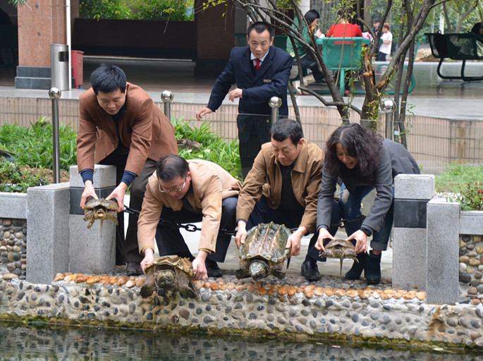 本网讯 2012年12月10日,许国彬副校长代表学校在北校区第九教学楼的池塘放养由广外北京校友会副会长鲁思明(79级日语)赠送的四只鳄龟。