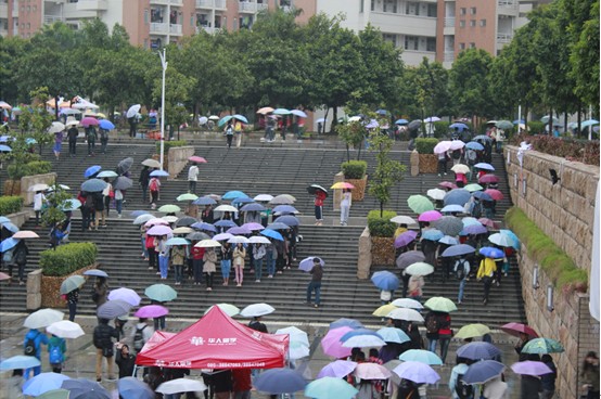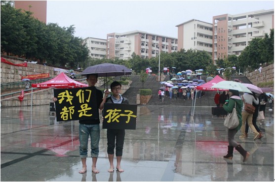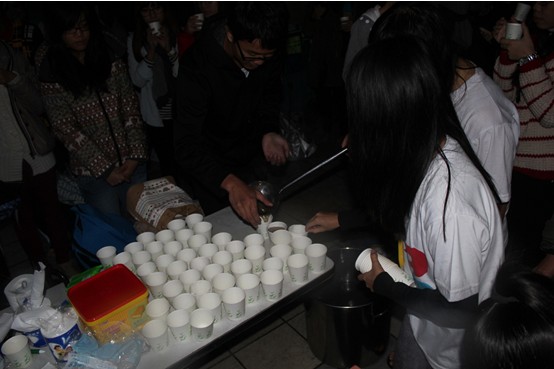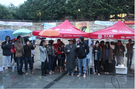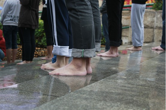 除了34名筑梦队员,预先招募的50名志愿者,活动还吸引了不少路人参与,下午五点,预先招募的的志愿者已经在隧道口阶梯上站成一个心形、鞋形框架。不少经过的同学见状也在筑梦队员的引导下参与进来,填充在心形、鞋型框架内。半个小时后,阶梯口的“心”已经被志愿者填满,“鞋”也顺利编成。管理学院的赵育明前天刚刚通过微博报名参与活动,今天赤足在雨中站了近两个小时。“刚开始好冷,站久了也没感觉了,想到大家都为了公益站着就觉得好有力量”,一名临时加入的财经学院同学告诉记者。而我校的两名外教Jack和Bob闻说这次活动,也脱下鞋参与到“慢闪”中去。用Bob的话说就是“I come here,without hesitation.”(“我没多想就来了。”)