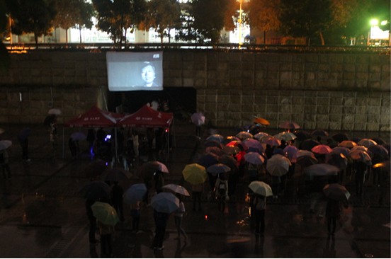 路过的同学在夜雨中驻足观看公益宣传片
