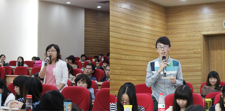 演讲结束后,听众就中国古代诗歌中体现的儒家思想、诗歌与其他文体的区别以及古诗词的翻译等方面纷纷向蒋述卓提出疑问。蒋述卓对翻译问题的解答于在场学习外语的学生相当有鼓励意义。他说到,诗歌的翻译是最难的,要坚持以“信达雅”为原则,在“吃透文化精神层面”的同时将“直译和意译结合起来”,进而将诗歌优美的意境和深邃的内涵充分表达出来,将中国古诗词推向世界。