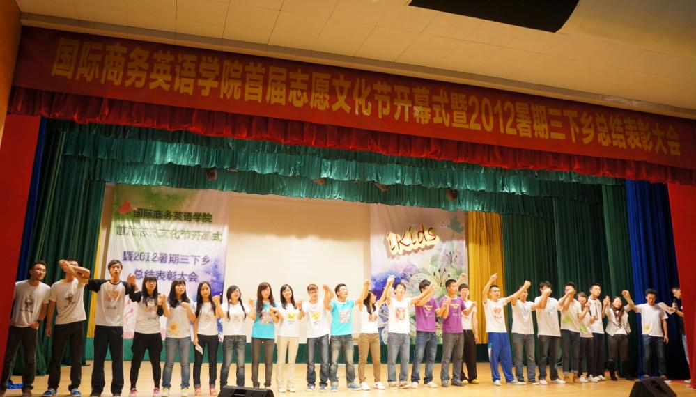 大会为商英学院暑期三下乡先进队伍、个人进行颁奖。仪式结束后,商英学院2012暑期三下乡记录片拉开汇报演出的序幕。现场不时响起欢呼声,各自的队旗舞动成一片海洋,队员们跟着歌舞、跟着视频共同回忆下乡点滴。