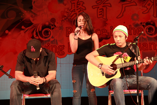当晚会接近尾声时,韩国留学生以一首Korean Style舞曲让全场为之沸腾。他们共同演绎了一首最近红遍全球的舞曲——“江南Style”,引得许多观众不自觉地走到舞台旁边,与他们一起唱一起跳。最后,留学生学院教师王一仟、蔡伟亮和美国籍学生沈天诚合作演绎的歌曲《奔跑》为晚会画上了圆满的句号。