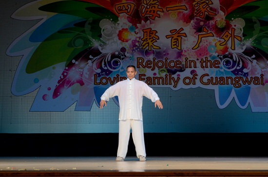 在今年世界文化节的晚会上流淌着各种中国元素,其中有广东警官学院武警们表演的中国功夫、太极及擒敌拳,他们希望用中国“以和为贵”的传统思想欢迎外国友人,他们的表演赢得了台下阵阵掌声;除此之外,还有校艺术团带来的葫芦丝独奏、筝萧合曲《春江花月夜》;今年秋之声亚军陈良璧也为观众献上一段劲歌热舞,将现场气氛带向高潮。