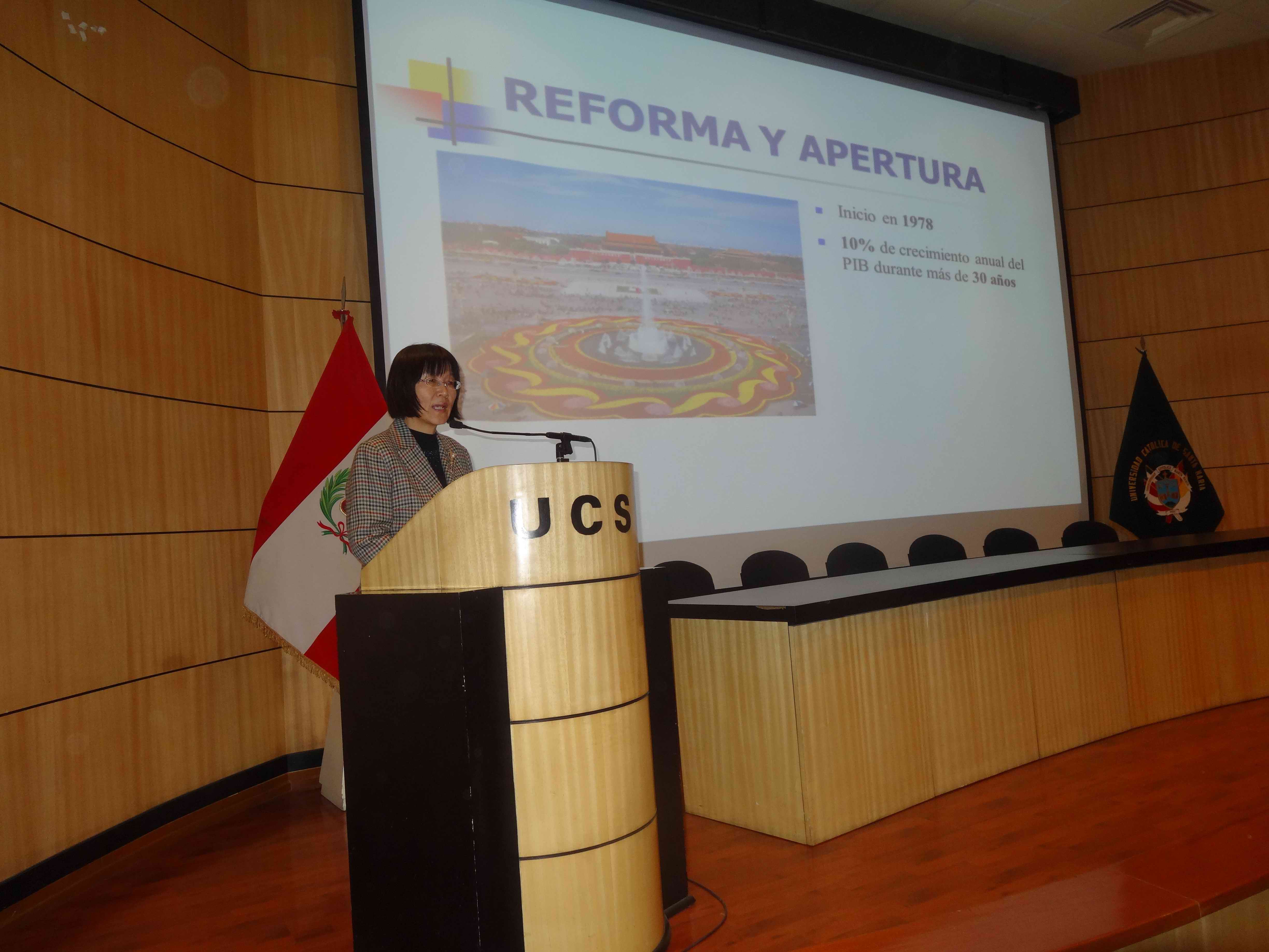 10月26日,中国驻秘鲁共和国特命全权大使黄敏慧莅临阿雷基帕,在圣玛利亚天主教大学礼堂发表演讲,介绍中国的发展概况以及中国和秘鲁双边关系的发展现状。黄敏慧的到来把整个中国文化周推向高潮。26、27日连续两天,孔子学院举办“高度外向型的经济--了解中国的进出口”研讨会,对持续升温的中秘经贸关系做了很好的诠释。