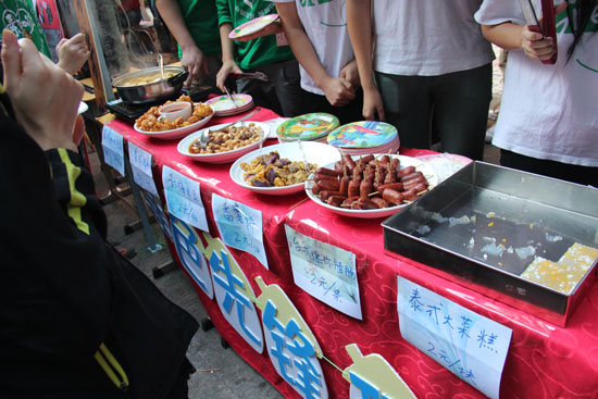 “我还要吃那个!”这个句子已经数不清多少次在校道上听到了。主校道上,来自三十多个国家的特色美食展现在各自的摊位上。如:西班牙的水果酒,德国的啤酒,尼日利亚的羊肉面包,马来西亚的咖喱鸡饭,日本的大阪烧,越南的春卷,韩国的粢饭、年糕等。各国美食琳琅满目,让师生们大饱口福的同时,热情的人流也导致校道上“水泄不通”。不少在场学生“抱怨”人太多,很难挤进摊位里。其中,韩国、日本、德国、西班牙等摊位更是难以靠近;泰国的玫瑰茄及木橘两种饮料也因独特的包装而大受欢迎;多哥的牛肉串让人赞不绝口,甚至很快就卖光了。