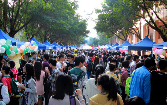本网讯 11月1日,由我校国际合作与交流处主办,留学生教育学院承办及校团委协办的“广东外语外贸大学第四届世界文化节”隆重开幕。本次世界文化节的主题为“四海一家,聚首广外”,并在主校道上拉开了序幕。