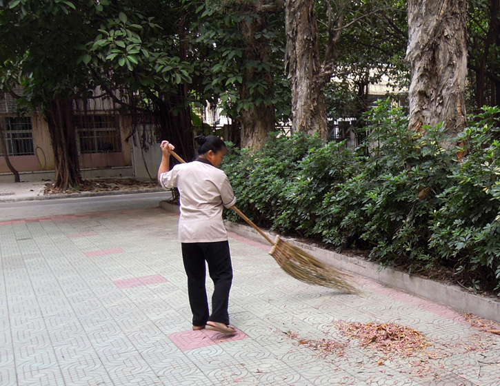 清晨七点半,当许多同学还在梦乡时,张阿姨已经上岗准备开始一天的工作。首先,她要清理各层楼前一天累积的生活垃圾,再给这些垃圾做一个简单的分类处理,随后把各层集中起来的垃圾用手推车运往位于兴安超市附近的垃圾集中回收点。仅仅这项工作,就要耗费大半天的时间。回到宿舍后,张阿姨开始给各层楼拖地。做完这些后,一整个上午已经过去。简单吃过午饭休息片刻,下午再继续未完成的工作,如擦墙壁、抹窗台、打扫公共冲凉房、清理排水沟等。在校工作九年,张阿姨用过大拖把、小拖把和配备的各种规格的铲子清理水沟,如果遇到难以拖干净的污渍,阿姨就用刷子一下一下地刷干净,当遇到有人往沟内倒入的茶叶渣等不易扫起的垃圾,张阿姨就用戴着手套的手仔细清理。打扫公共冲凉房容易遇到的问题就是排水口被堵,张阿姨要用螺丝刀来清理堵塞物,疏通排水口。下午五点半,一天的工作才真正告一段落。