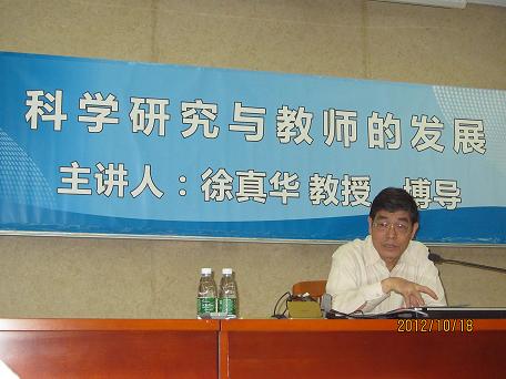 徐真华的报告包括三个内容:学科建设的重点内容是什么、教师科研工作与职业发展、教师如何提高自主研究能力。徐真华指出,在“教师个人科学研究”上,一要注重科研的研究方法,提高自主研究的水平;二要有创新精神,以创新提高科研工作的质量;三要摒弃科研中的功利思想,将科研作为教师职业的生命主线。在报告中,徐真华旁征博引,以深入浅出的理论分析和丰富的实际案例对教师如何以科学研究推动自身的职业发展做了精彩的论述,在教师中引起了广泛的共鸣。