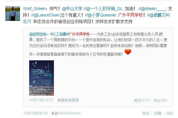 近日,“广外平民学校研究团队”和“经贸学院L.O.V.E.志协”在南校各宿舍楼下张贴了一张招募志愿者海报:广外平民学校——为校工友授课,提供一个再教育的平台,满足他们对知识的渴望;一个提升自我的机会,让他们收获一段不平凡的人生。想为这份活动添砖加瓦吗?助教、讲师团队需要你!
