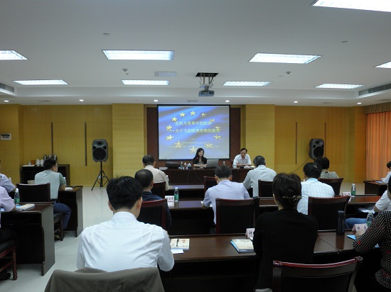 本网讯 10月18日,应省委组织部邀请,广东国际战略研究院副秘书长、欧洲研究中心主任蔡红为广东省第5期领导干部培训班授课。本次授课以“危机与变革中的欧洲——关于当前欧洲形势的报告”为主题,深入分析了欧洲当前面临的各种危机,全面解读了欧债危机以来欧盟开展的一系列改革及其面临的困境,并预测了欧盟的未来与前景。授课对象主要为省内各地市组织部副部长。