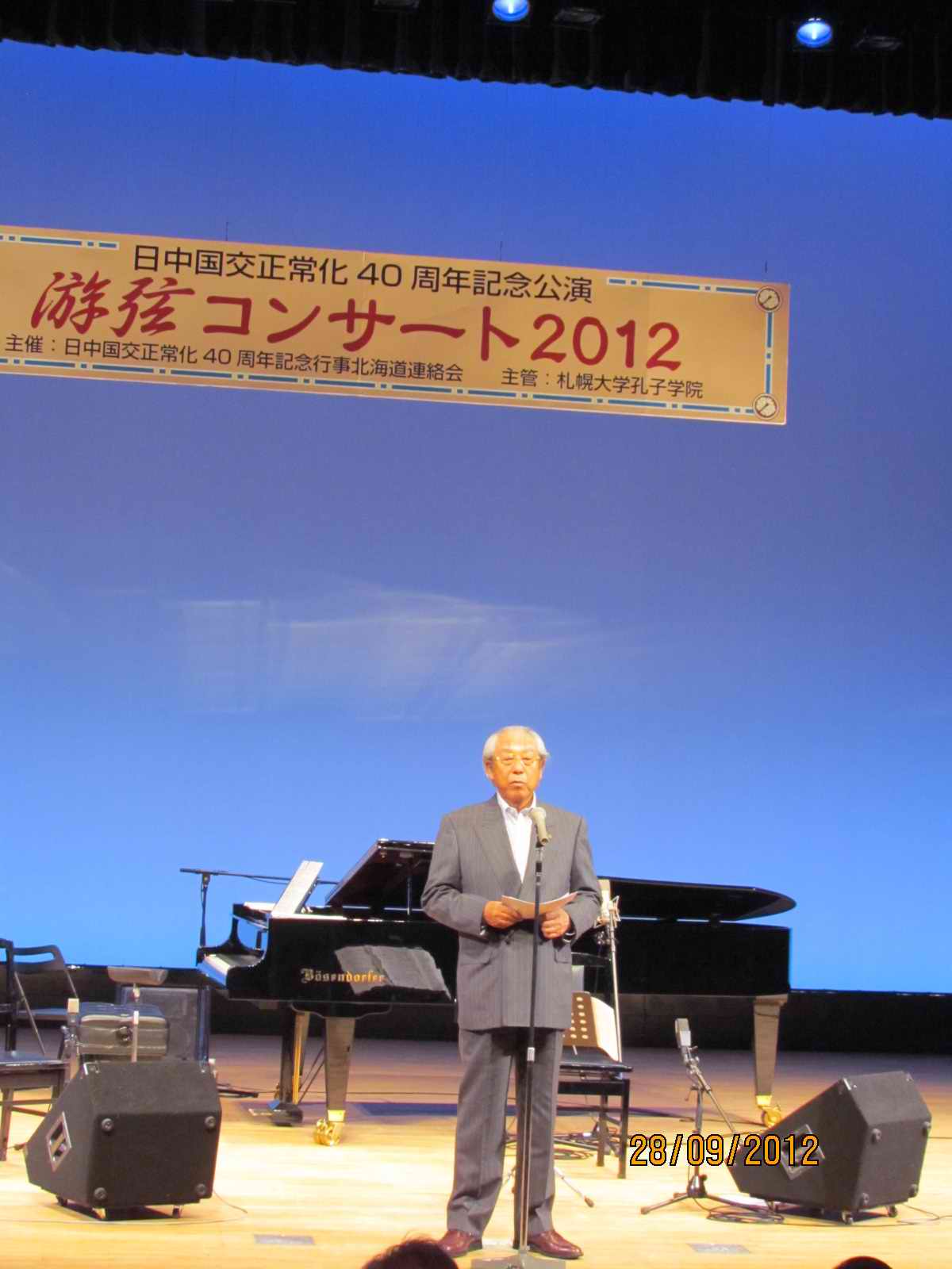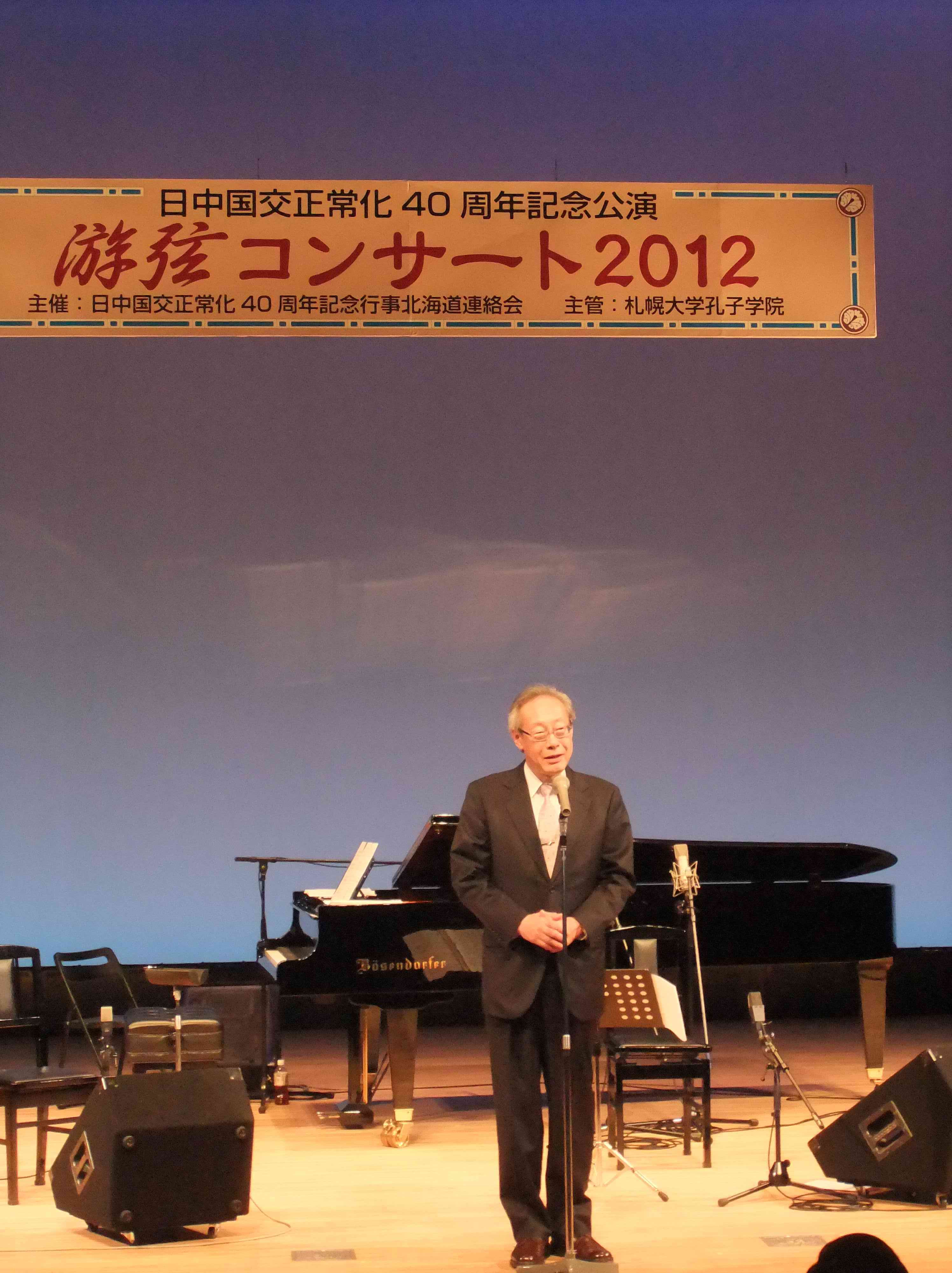 音乐会伊始,“纪念中日邦交正常化40周年活动北海道联络会”会长、北海道日中友好协会会长青木雅典致辞。他谈到,40年前,中国日两国领导人排除万难,实现了中日邦交正常化,为中日两国友谊打下良好的基础,作为今人,我们应该珍惜这一切。他认为,在这具有历史意义的今天,由民间团体组织举办这场音乐会,更加具有现实的意义。