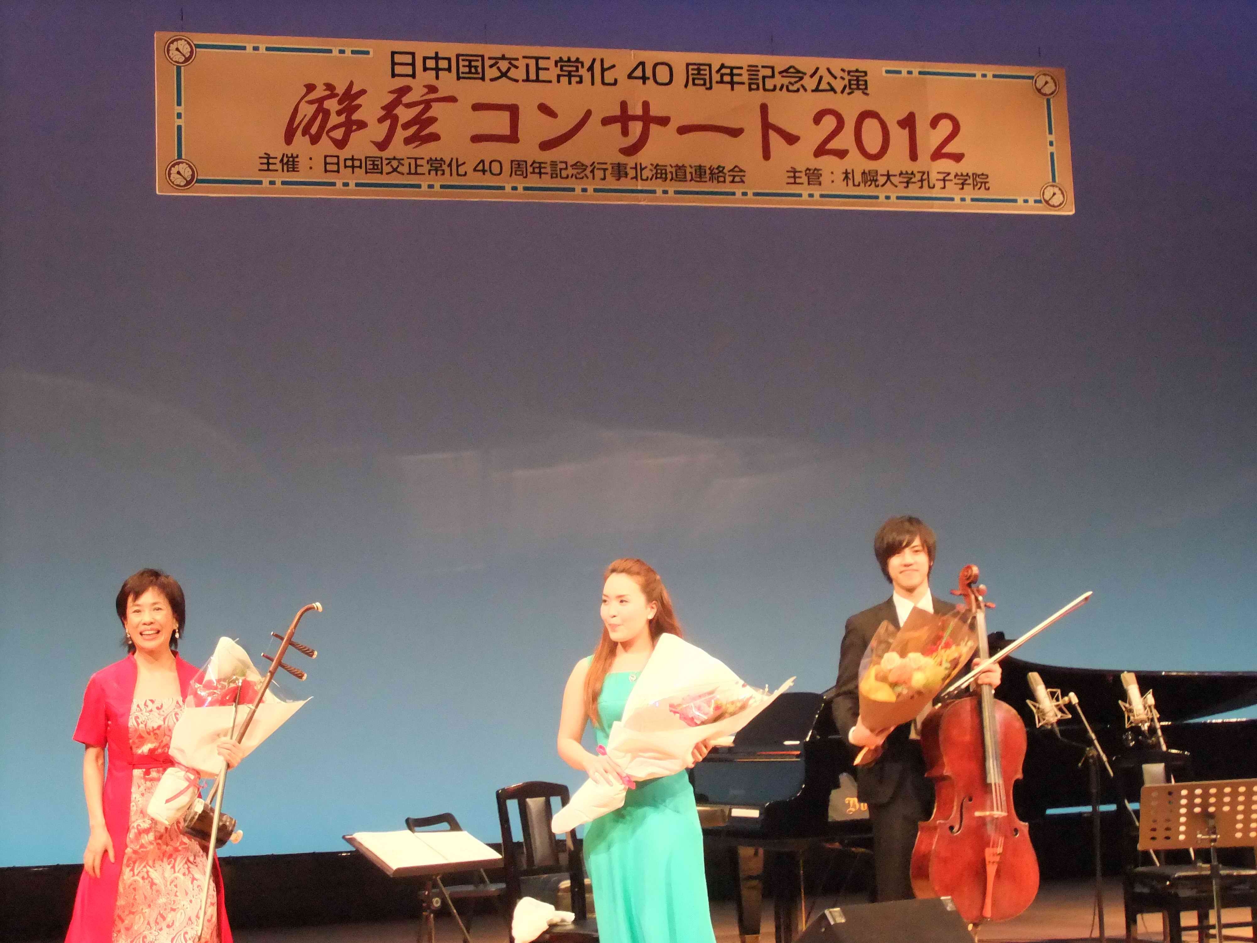 本网讯 9月29日,日本札幌大学孔子学院主办的“游弦音乐会2012”在札幌大学上演。这场音乐会是“纪念中日邦交正常化40周年活动北海道联络会”组织和筹划的中日民间系列交流活动之一。旅日中国二胡演奏家彭秀敏、日籍大提琴演奏家中条诚一和钢琴演奏家外川真里亚三人组成的音乐组合给大家献上了一场充满中国元素的音乐会。