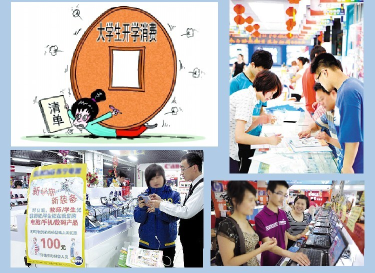 除了购物网站,数码卖场也显然比往常更热闹,不少学生与家长的身影穿梭其间。新生们从琳琅满目的电子产品中选出自己的心仪装备,有的为了迎合专业需求,有的满足个人要求,有的“英雄不问出身,只选对的,不买贵的”。其中,以“奖励”为名带准大学生来消费的父母很多。普通家庭通常只是花1000多元买部手机,家庭条件优越的,笔记本电脑、PSP、iPhone等电子产品一次买齐,花费上万。电脑价位方面,消费者通常都瞄准售价在3000元到4000元不等的机型。某同学列举了自己的开学购物清单,他要购买5000元左右的iPhone4S手机,6500元左右的笔记本电脑,以及一台4000元的数码相机。当然也不是每个人都在盲目消费,理性的其实更多,他们用着400多块钱的普通手机也很高兴,因为,适合自己的才是最好的。