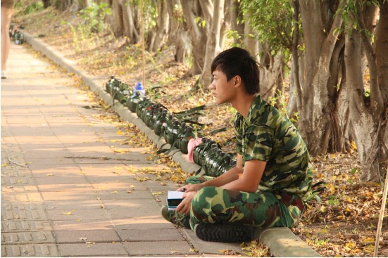 “面向太阳,站军姿一个小时!”教官的一声令下,又有苦头要受了!趁教官走到那边去,先来伸展一下站得快麻了的腿。不好,教官又来了!“那个谁,动什么动!再动给你加多一个小时!”军令如山,吓得本来弯曲的小腿瞬间绷直,只好再次在心理哀怨:“教官你怎么还在这?”