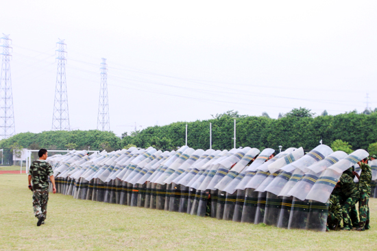 “广外野狼、激情飞扬、除暴安良、数我最强”。警棍盾牌方队—“野狼队”左手持盾牌,右手挥警棍,迅速跑阵组成防暴墙,不时发出“狼音”,不是气势恢宏的时候也让人感觉到“危机四伏”。“我们是一群狼友,见到防身术的女生们会开她们玩笑‘小绵羊’”。此次会操表演新加的部队除了持盾牌的“野狼队”之外,还有每天扛着8公斤“小钢枪”的“战术方阵”,他们摸打滚爬,演练战术,力争做到“广外突击、唯我独尊、首战用我、用我必胜!”。