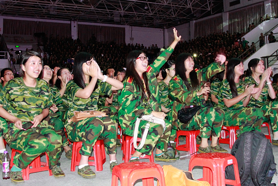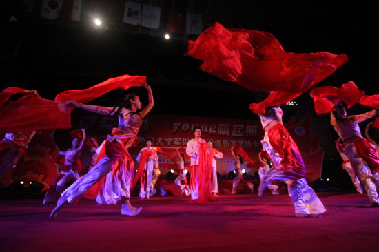 更让人意想不到的是,平时严肃凶狠的教官原来也可以很“韩系”。随着背景音乐的响起,健硕的教官们穿着不同颜色的休闲服跳出了韩式舞步,不时向台下的新生“放电”。整齐的机械舞、轻盈的韩式电子舞,完全改变了教官给人的“五大三粗”的形象,他们精彩的表演丝毫不逊色于当红的韩国男子组合。整个会场都“热”了起来,新生们的掌声、尖叫声、欢呼声响彻北校体育馆。