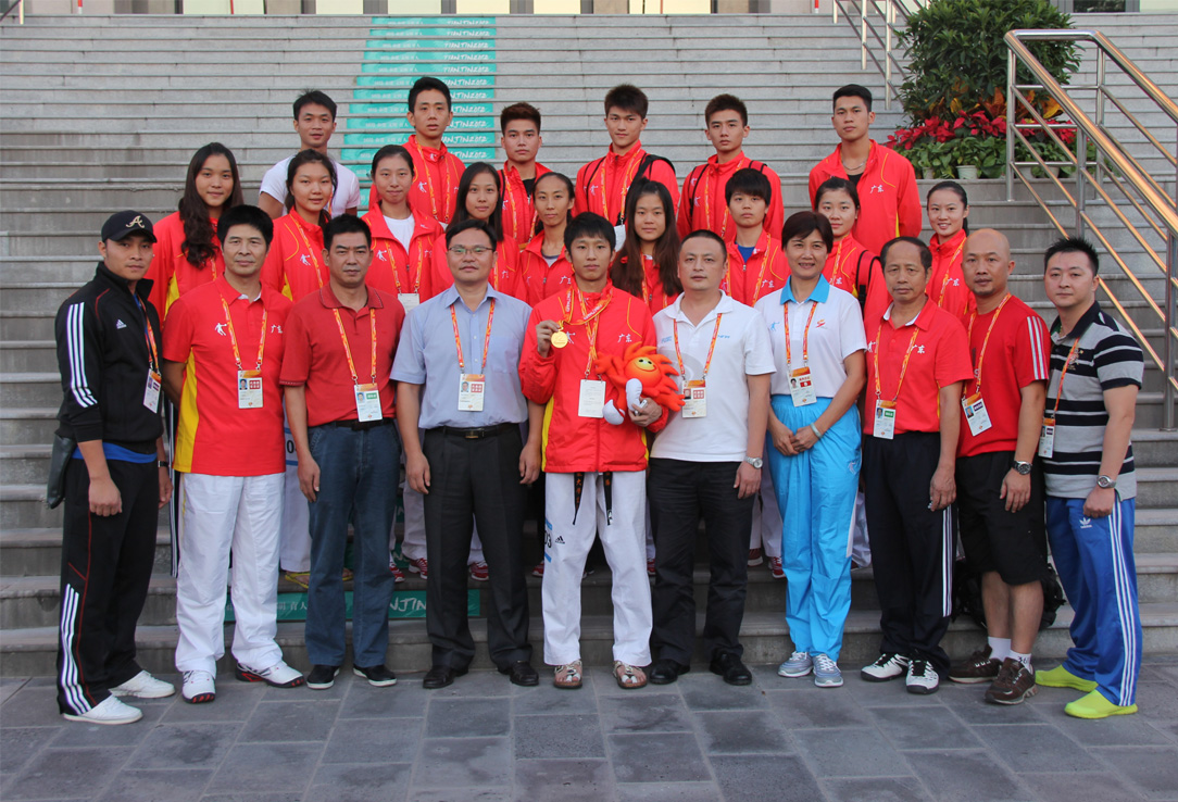 跆拳道是首次出现在大运会的赛场上的体育项目。与往常的跆拳道比赛不同,此次比赛前三天为竞技比赛,重量级由大到小;后两天为品势项目的比赛。首日,肖扬同学一路过关斩将最终决赛以7:4的成绩打败天津选手路正,摘得男子62公斤级桂冠,是广东跆拳道队的首枚奖牌,也是广东代表团夺得第五块金牌。我校思科信息学院的黄婷同学挑战海南选手失败,最终获得女子72公斤级第五。