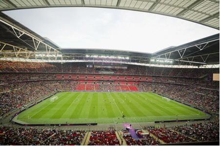 这里,就是宏观壮观的温布利球场。今夜,伦敦奥运会女足的一场比赛在南美劲旅巴西以及东道主英国之间展开。
