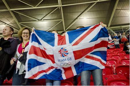终场哨声响起,英国队获得了比赛胜利,球迷们欢欣鼓舞的挥舞着国旗