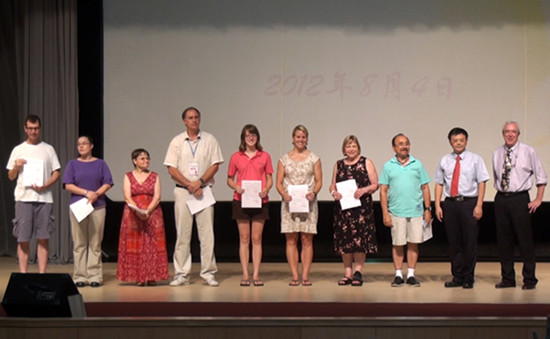 陈开举和John首先代表主办方及全体外教发言。他们对学员们的进步表示祝贺,感谢为夏令营成功举办付出辛勤劳动的所有工作人员。何勇斌给来自美国国际教育集团的外教颁发荣誉证书,感谢美国国际教育集团总裁及所有外教为广外大快乐英语夏令营品牌的形成和塑造做出卓越的贡献。