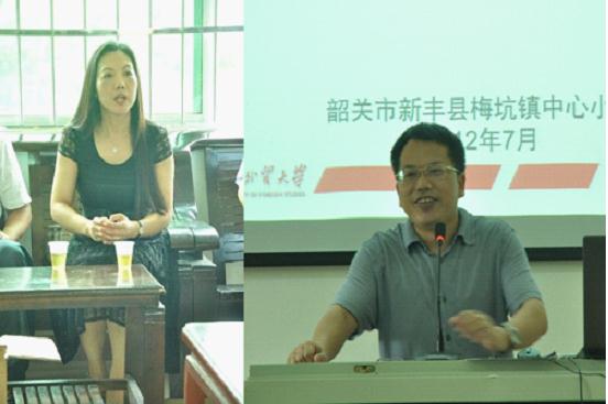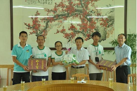 本网讯 7月25日,校党委宣传部部长胡文涛、校团委书记谢秀兰、思想政治理论学院院长宋善文、管理学院党委副书记罗海洋一行冒雨来到韶关市新丰县,看望管理学院参加暑期“三下乡”实践的学生,并向同学送上了亲切的问候。新丰县县委书记、县人大常委会主任陈俊林,县委常委、纪委书记谢林茂,副县长谭雪梅,教育局局长刘一敏,县一中校长郑秀强等接待了我校一行。