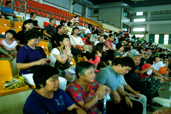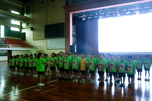 经过将近一节课时间的排练后,下午3:30随着中山纪念中学校歌的响起,本期夏令营的闭幕仪式在体育馆内正式启动。父母早早就到了观众席上等待观赏孩子们的演出,而孩子们的眼睛也不断地望向观众席寻找那些最熟悉的脸庞。从观众席上可以看到,不仅父母来了,孩子们的爷爷奶奶也带着热切的心情来到了闭幕式的现场。