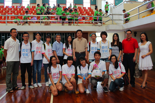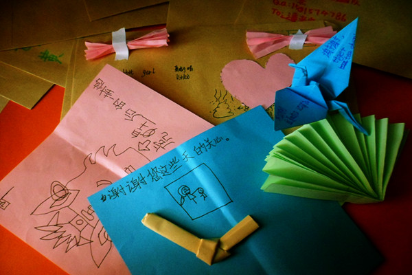 和锻炼,我校英文学院Dream Deliverers 队7月19日在“三下乡基地”----中山纪念中学迎来了第一期夏令营闭营仪式。孩子和父母在最后一个手语节目《感恩的心》表演完毕后温情相拥,体育馆之内盈溢着满满的亲子之情。 9日上午是各位队员最后一次为孩子们上课,经过六天的相处,队员们已经和各班的孩子建立了一定的感情,因而大家对最后一节课格外重视。为了给孩子们留下美好的纪念,各班的助教各出奇招。四班的助教温静和郭建涛一起买了信纸和信封,用心地为每一位孩子写上自己的祝福和感言;二班的助教邓雅方给一位小朋友在手腕上画了一个小手表,惹得许多小朋友争先恐后地找她在自己的小手上签上“雅方”二字;三班的助教则上了一节以“Card Design”为主题的英语课,要求每位小朋友制作一张卡片送给老师,并且写上自己的感想和祝福;卡片收上来后,助教们心中又是欣慰又是不舍,百感交集。