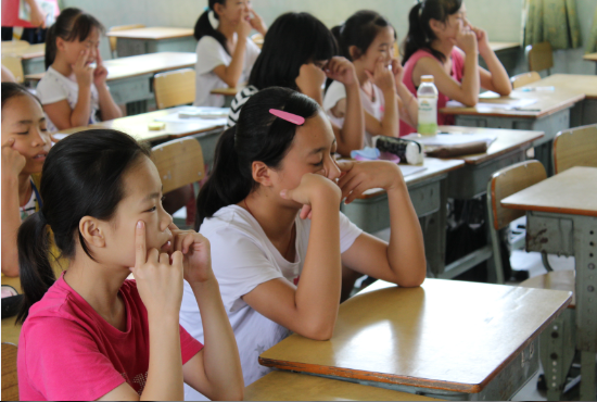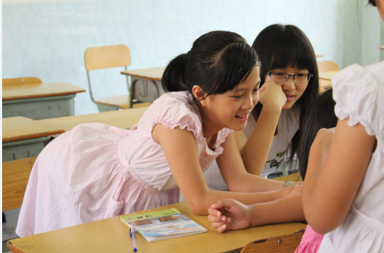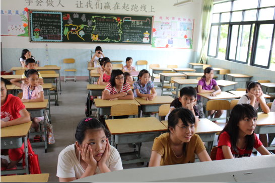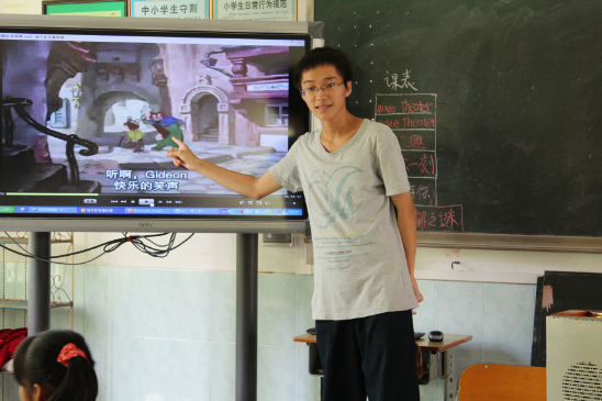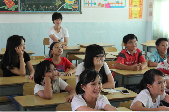 小姑娘和班主任潼姐姐在看着大屏幕的歌词