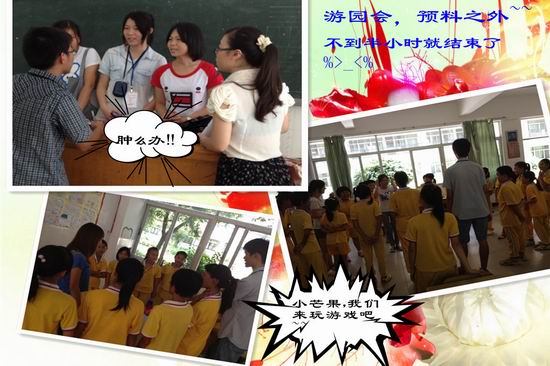 另外,有一个小插曲。游园会结束后,B班其他小朋友都在跟姐姐哥哥们玩游戏,唯独有两三个小男孩坐在一边闷闷不乐,眼眶的泪水在打转。经过了解,原来是他们小组在游园比赛中输了。可能是不甘落后,可能是策略失误,可能是自我反思。最后,在我们的开导下,他们的脸上重现了笑容,也融入游戏跟其他小朋友一起玩耍。