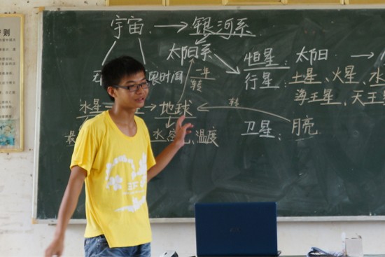 课外组黄振杰在地理课上首先给学生介绍八大行星。当黄振杰叫学生例举出一些八大行星时,出乎意料的是,学生们竟然说出了“明星”“太白金星”等天马行空的答案,惹得老师也哭笑不得。介绍完八大行星后,黄振杰接着给大家讲四大海洋。可大家居然立刻条件反射到“喜羊羊”“灰太狼”,课堂气氛活跃,还不时发出阵阵笑声。最后黄振杰还告诉大家,现在地球上还是处于缺水状态,呼吁大家节约用水。