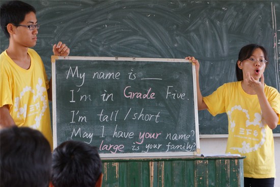 “Doe ,a deer, a female deer…”轻快悦耳的歌曲声把大家引入英语的殿堂。义教组组长钱佳慧发现很多学生都喜欢唱歌,她决定投其所好,寓教于乐。学生都陶醉在悦耳的歌声中,也跟着轻轻哼唱,很快学会了这首歌,还在课堂上一展歌喉,稚嫩的歌声在教室中飘荡。