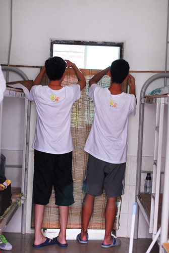 经过三小时的长途跋涉,“传承3”于上午11点顺利到达大塘中学。疲累的队员们顾不上休息,马上将行李搬进宿舍。宿舍的环境稍显简陋,但乐观的传承队员们使出“十八般武艺”对各宿舍进行全面大清洁。浴室没有门,队员们便用席子代替;床铺布满蜘蛛网,队员们便用扫帚将其打扫干净。原本布满灰尘的宿舍焕然一新,队员们坐在自己的“安乐窝”里,一种“家”的开心感觉盈满心间。